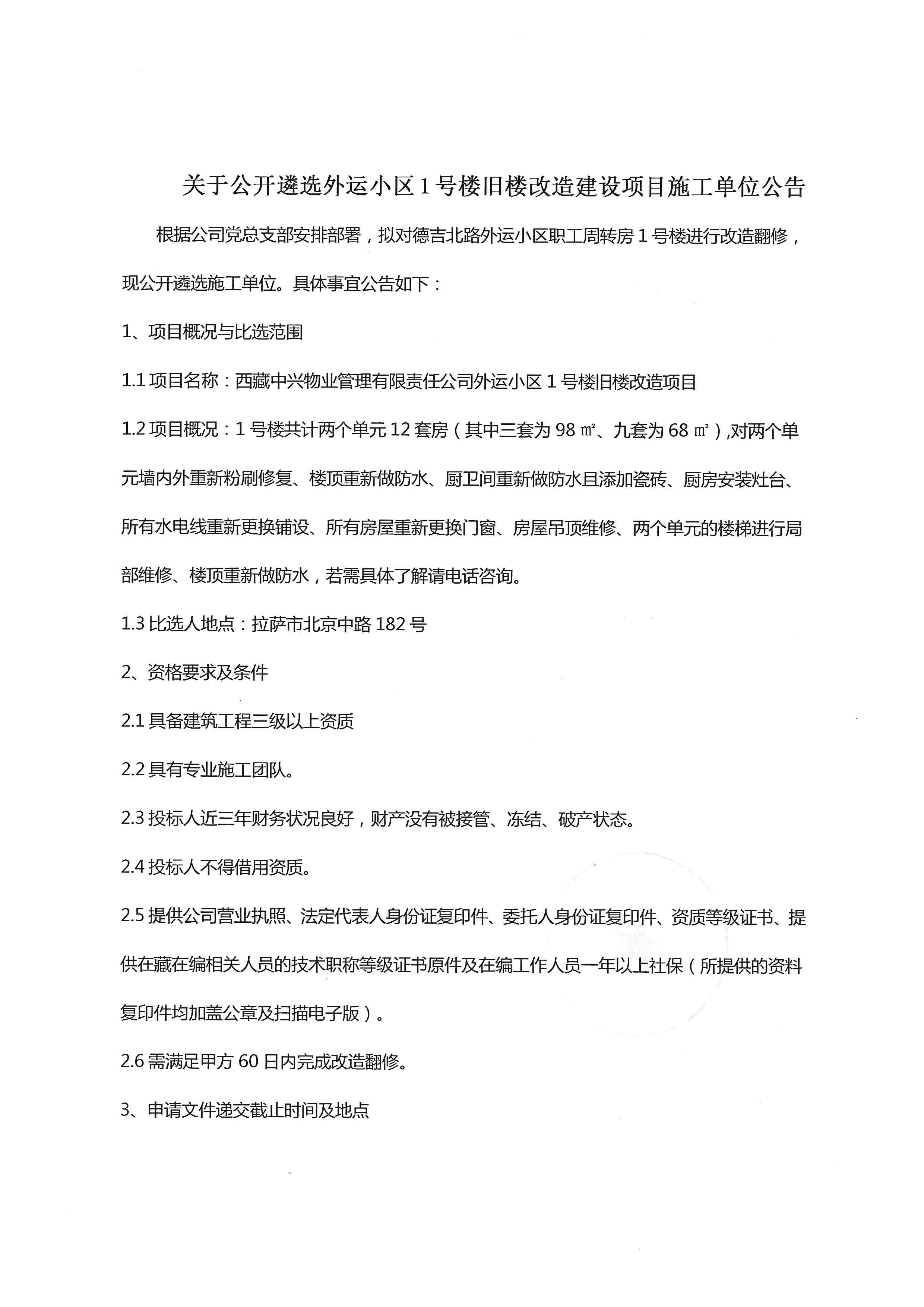 關(guān)于公開遴選外運(yùn)小區(qū)1號(hào)樓舊樓改造建設(shè)項(xiàng)目施工單位公告