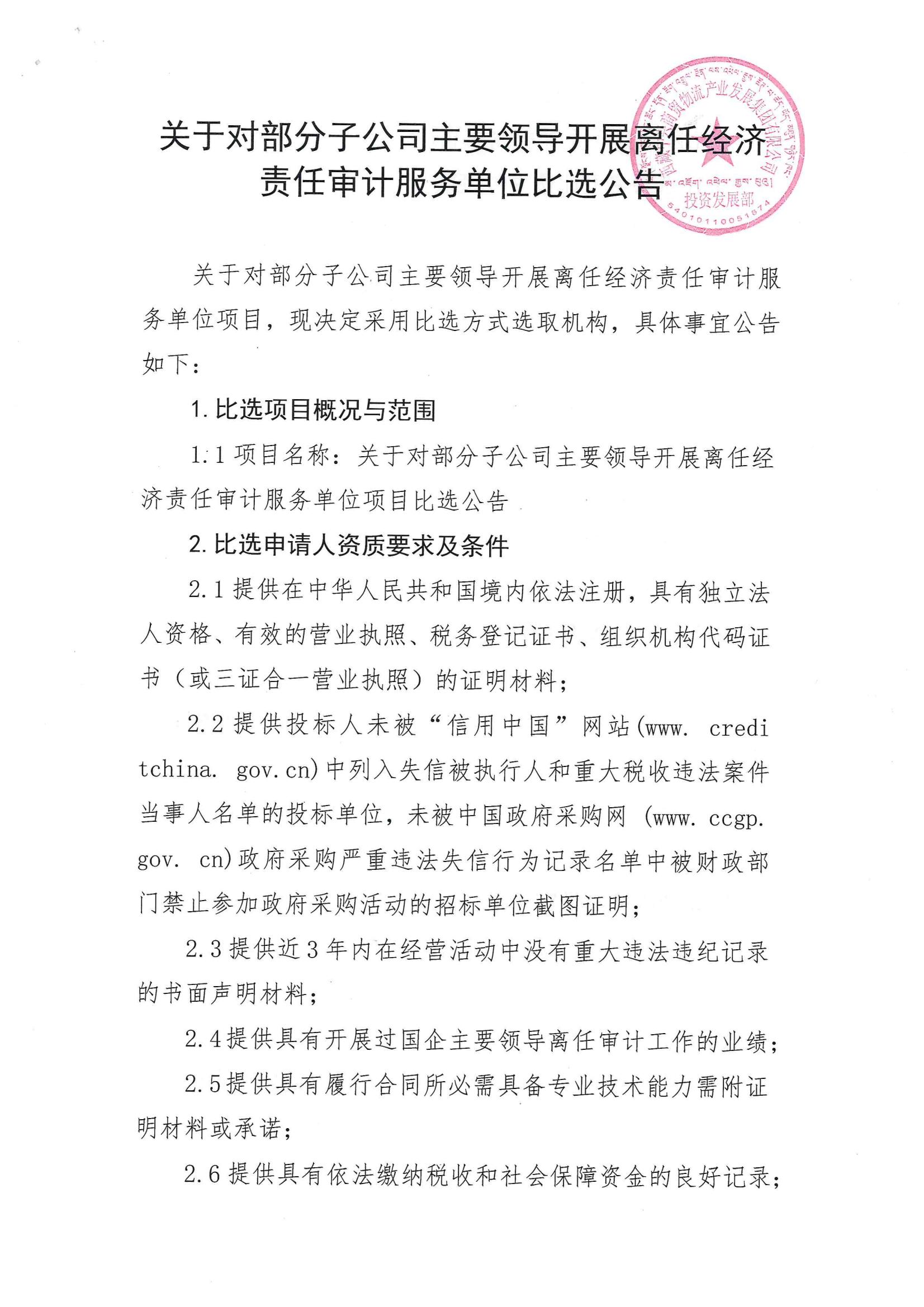 關(guān)于對(duì)部分子公司主要領(lǐng)導(dǎo)開(kāi)展離任經(jīng)濟(jì)責(zé)任審計(jì)服務(wù)單位比選公告