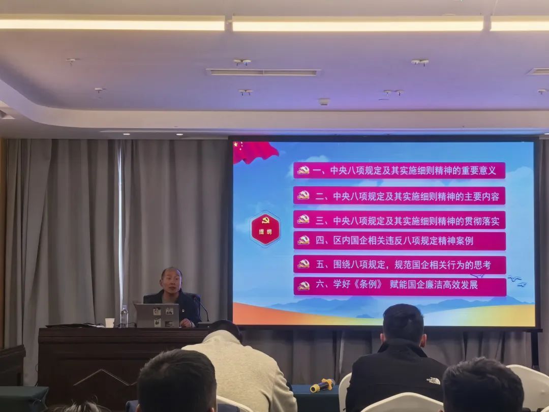 講座中,王老師從中央八項(xiàng)規(guī)定出臺(tái)的背景、核心要義、實(shí)踐要求出發(fā),結(jié)合國(guó)有企業(yè)實(shí)際,深入系統(tǒng)解讀了中央八項(xiàng)規(guī)定精神的深刻內(nèi)涵和實(shí)踐要求。通過典型案例分析,深入剖析了“四風(fēng)”問題的頑固性、隱蔽性,強(qiáng)調(diào)了新時(shí)代新征程上持續(xù)深化作風(fēng)建設(shè)的重要意義,為全體黨員干部上了一堂生動(dòng)的政治紀(jì)律課。