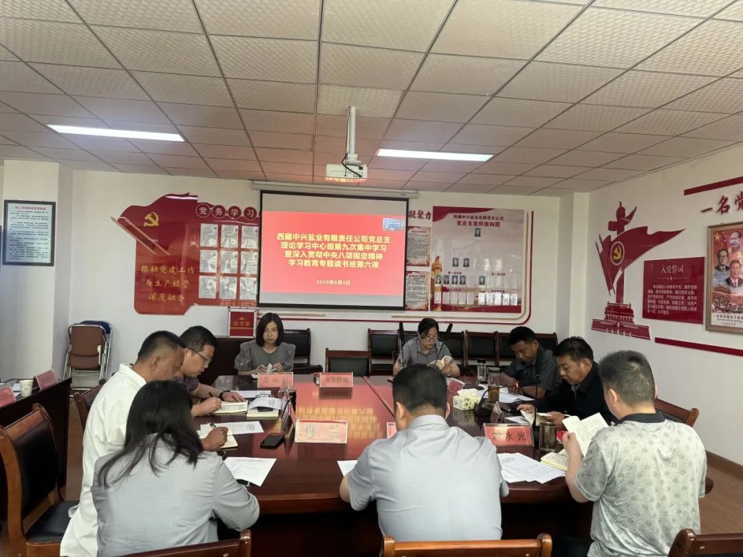 ???????????????????????????????????????????????????????????????????????????為持續(xù)推動中央八項規(guī)定精神學(xué)習(xí)教育走深走實,錘煉過硬作風(fēng)、永葆政治本色,以嚴的基調(diào)激濁揚清,確保西藏中興鹽業(yè)有限責(zé)任公司在高原國企行業(yè)持續(xù)向快向好發(fā)展中突顯積極作用,2025年8月5日上午,西藏中興鹽業(yè)有限責(zé)任公司黨總支組織召開理論學(xué)習(xí)中心組2025年第九次集中學(xué)習(xí)暨深入貫徹中央八項規(guī)定精神學(xué)習(xí)教育專題讀書班第六課專題學(xué)習(xí)會,會議由公司黨總支書記、董事長嘎永同志主持,在家班子成員、在家黨員(含預(yù)備黨員)共計29人參加學(xué)習(xí)。