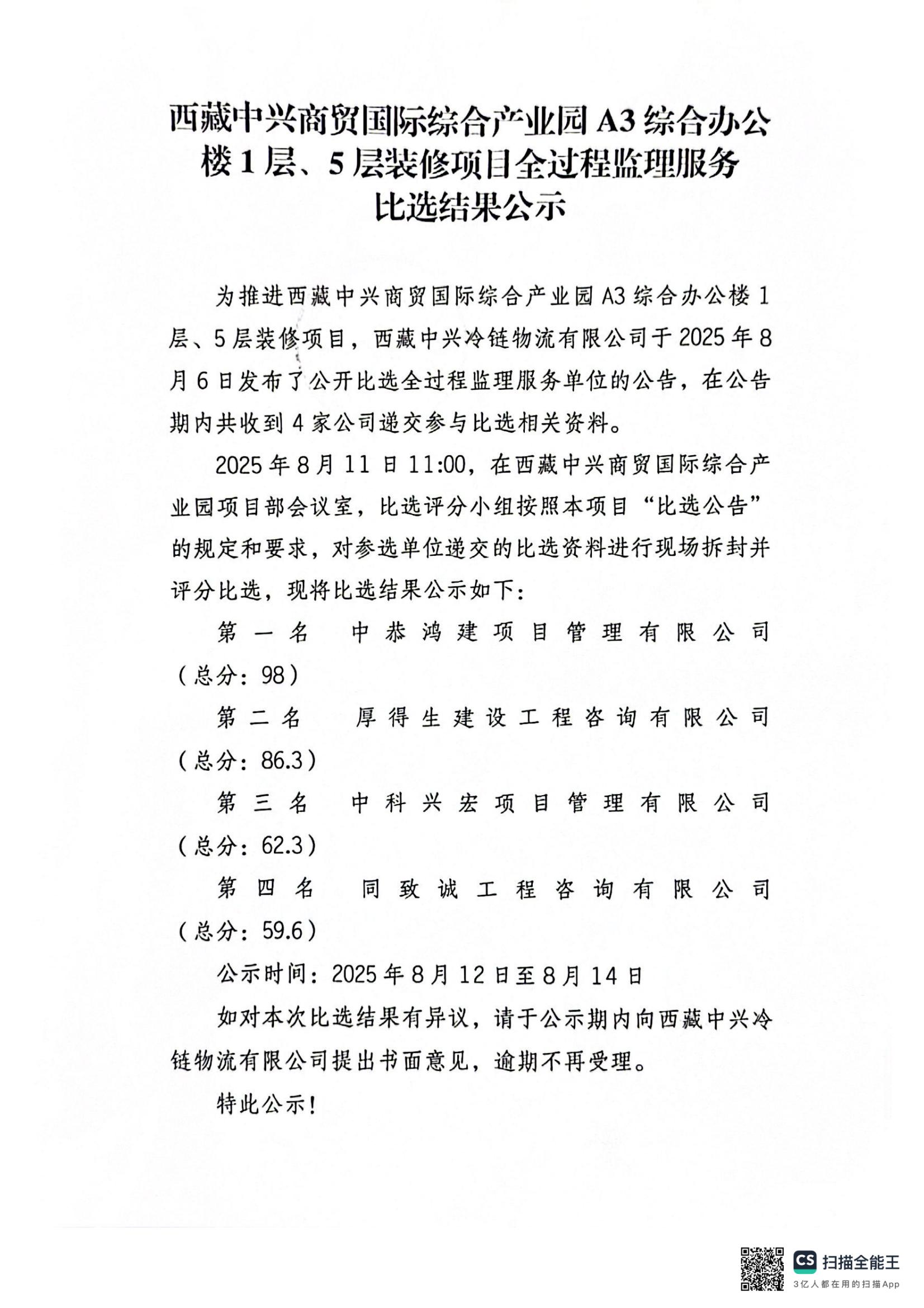 西藏中興商貿(mào)國際綜合產(chǎn)業(yè)園A3綜合辦公樓1層、5層裝修項目全過程監(jiān)理服務(wù)比選結(jié)果公示
