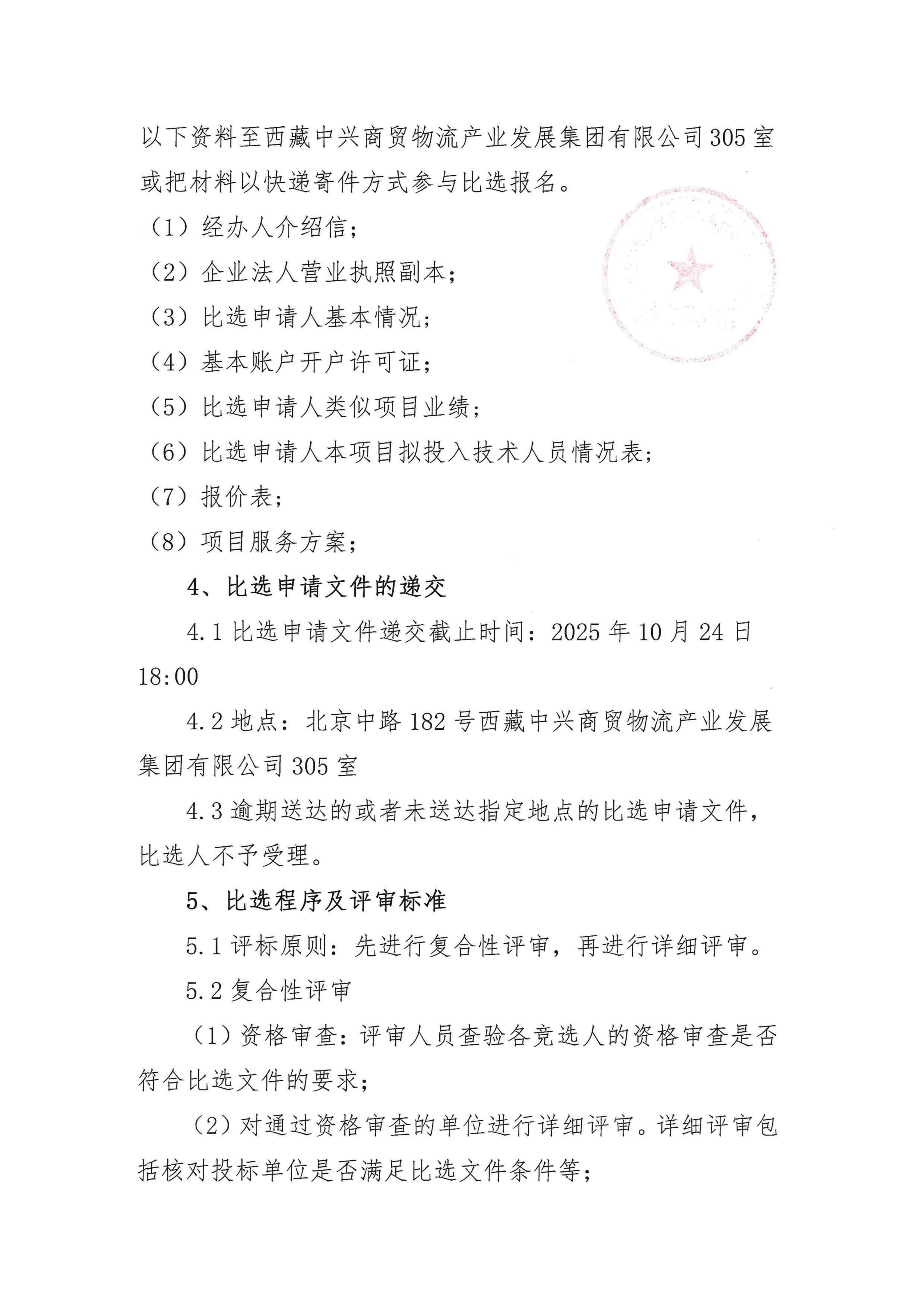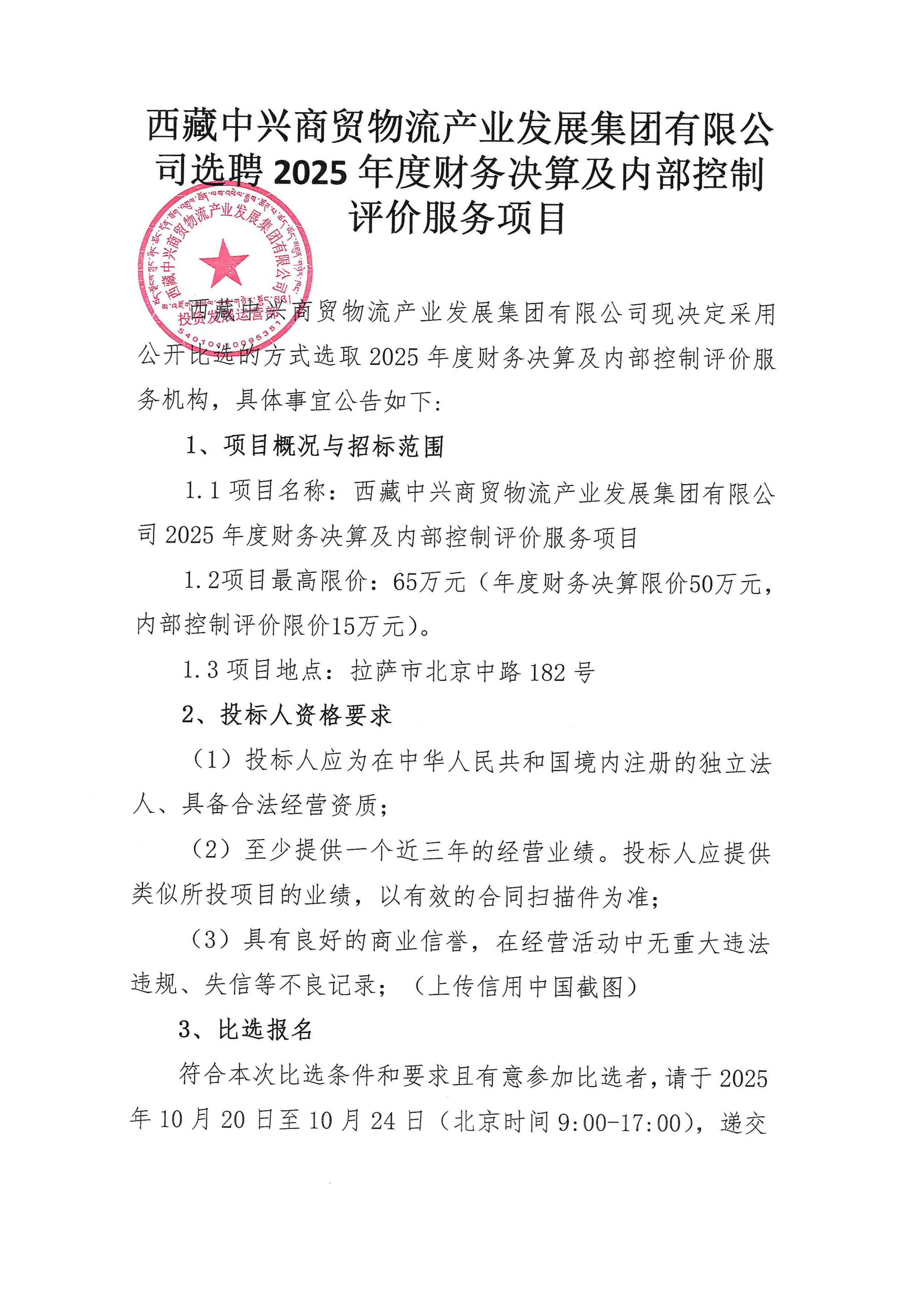 西藏中興商貿物流產(chǎn)業(yè)發(fā)展集團有限公司選聘2025年度財務決算及內部控制評價服務項目