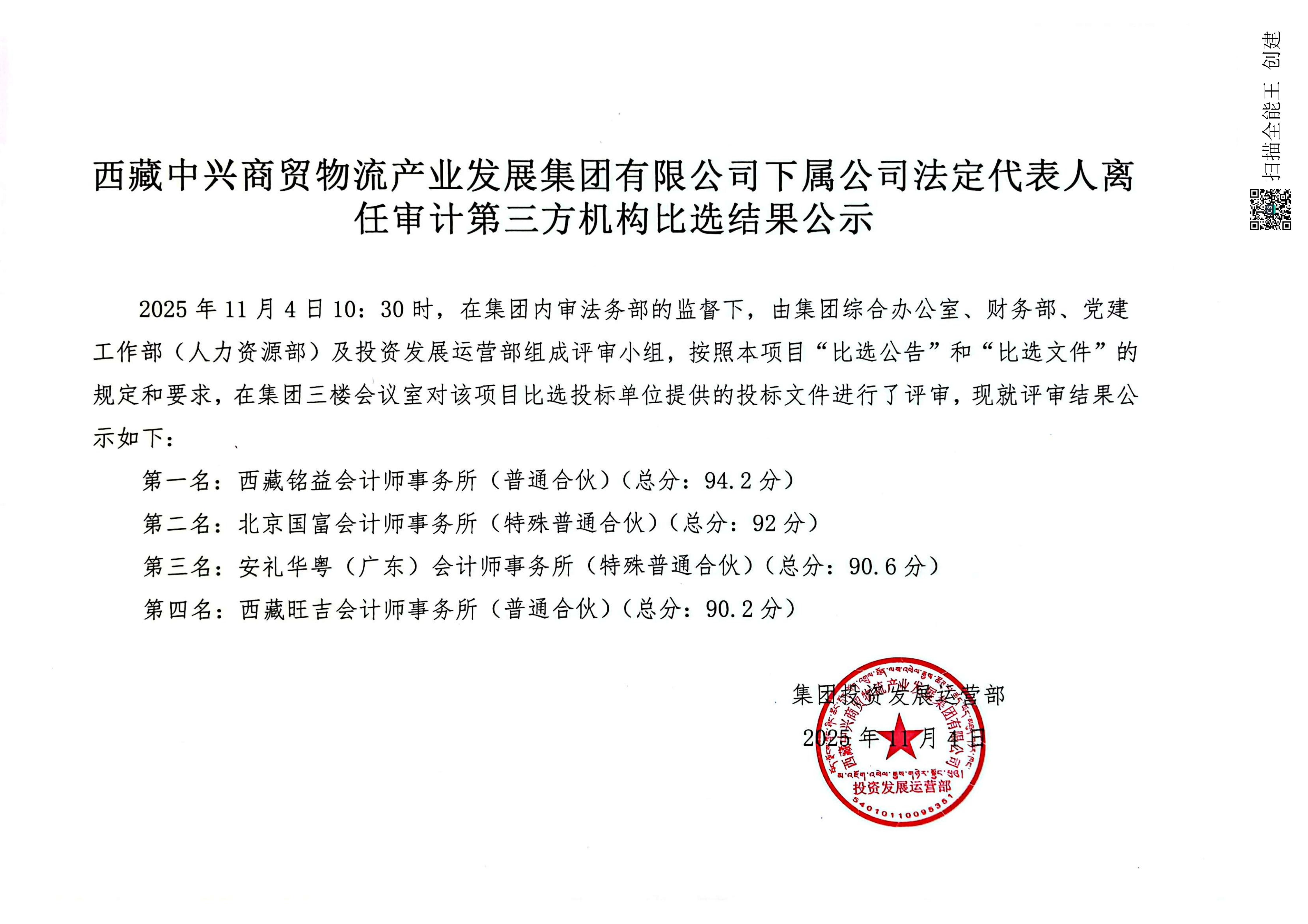 西藏中興商貿(mào)物流產(chǎn)業(yè)發(fā)展集團(tuán)有限公司下屬公司法定代表人離任審計(jì)第三方機(jī)構(gòu)比選結(jié)果公示