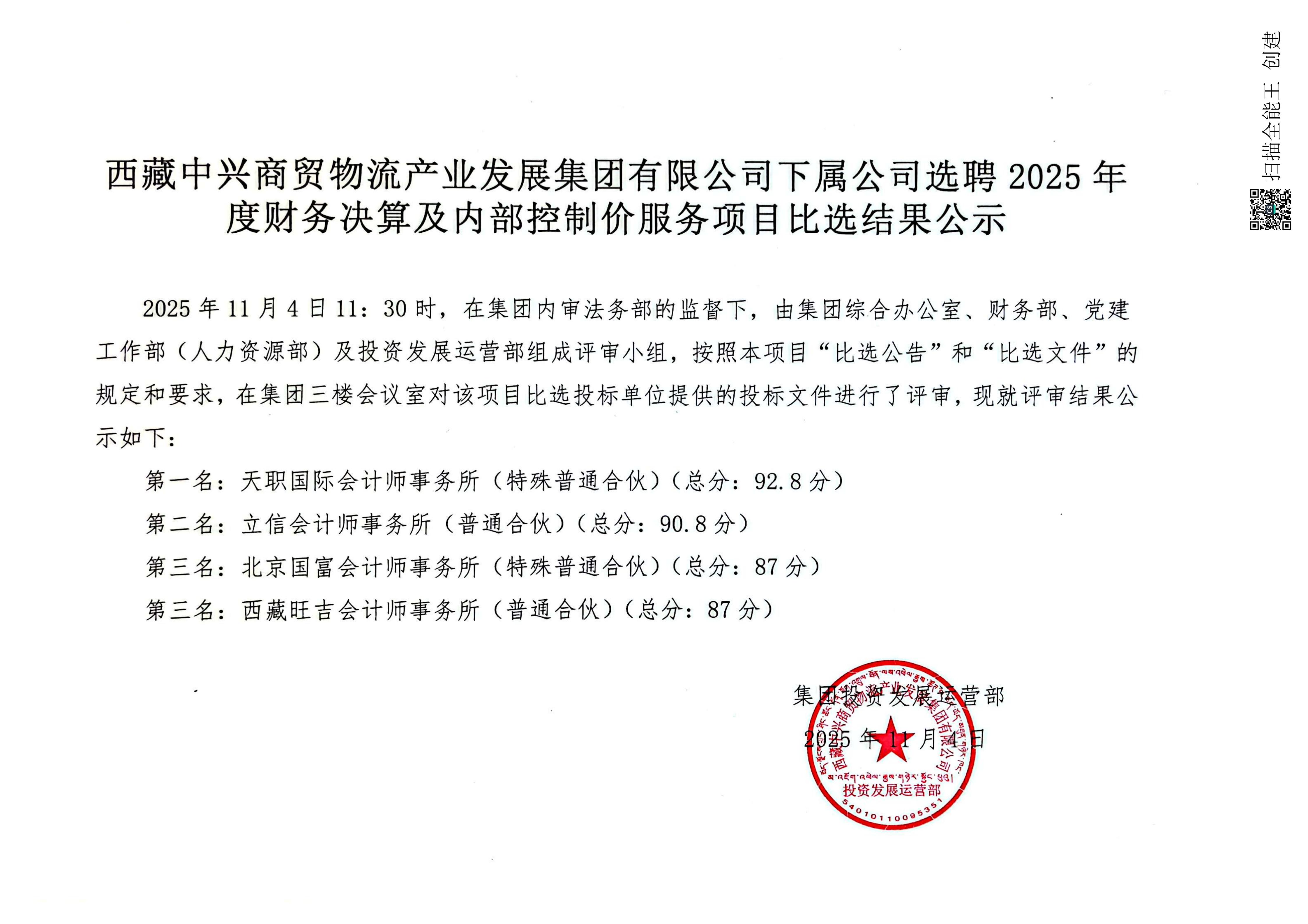 西藏中興商貿(mào)物流產(chǎn)業(yè)發(fā)展集團(tuán)有限公司下屬公司選聘2025年度財(cái)務(wù)決算及內(nèi)部控制價(jià)服務(wù)項(xiàng)目比選結(jié)果公示